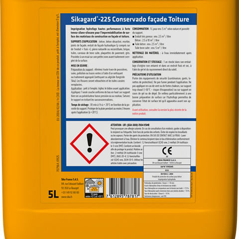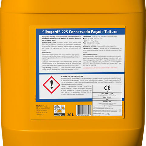 Sikagard®-225 Conservado Façade-Couverture est une imprégnation hydrofuge incolore hautes performances, à forte teneur en silane-siloxane pour l’imperméabilisation de surface des matériaux de construction en façade et en couverture et extérieurs particulièrement exposés aux intempéries.